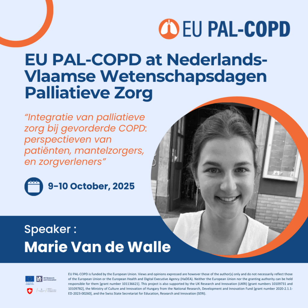 The EU PAL-COPD project will be represented at the upcoming Nederlands-Vlaamse Wetenschapsdagen Palliatieve Zorg (Dutch-Flemish Scientific Days for Palliative Care), taking place on 9–10 October 2025, where Marie Van de Walle (Ghent University) will present results from the project’s pilot study.